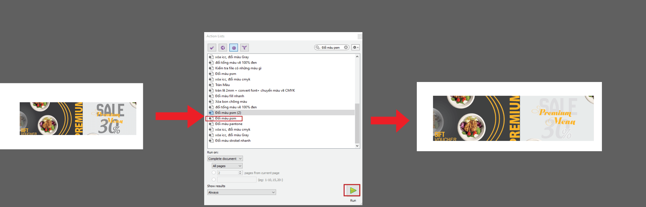 - Chọn Action “Đổi màu PSM”.