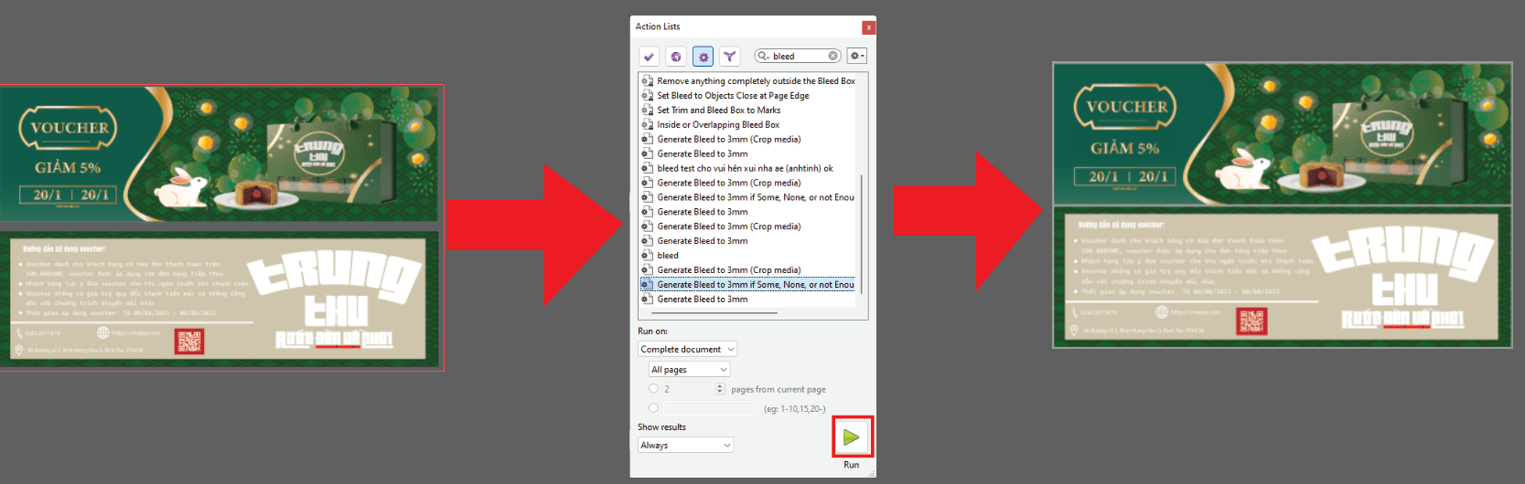 Cách hoạt động của action này dựa trên việc phân tích nội dung xung quanh Trim Box. Trước tiên, hệ thống kiểm tra xem file đã có bleed hay chưa. Nếu chưa có, action sẽ tạo bleed mới bằng cách mở rộng nội dung từ mép thiết kế ra ngoài. Nếu đã có nhưng nhỏ hơn 3 mm, action sẽ tiếp tục mở rộng thêm cho đủ. Nếu bleed đã đủ 3 mm hoặc hơn, action sẽ giữ nguyên và không thay đổi.