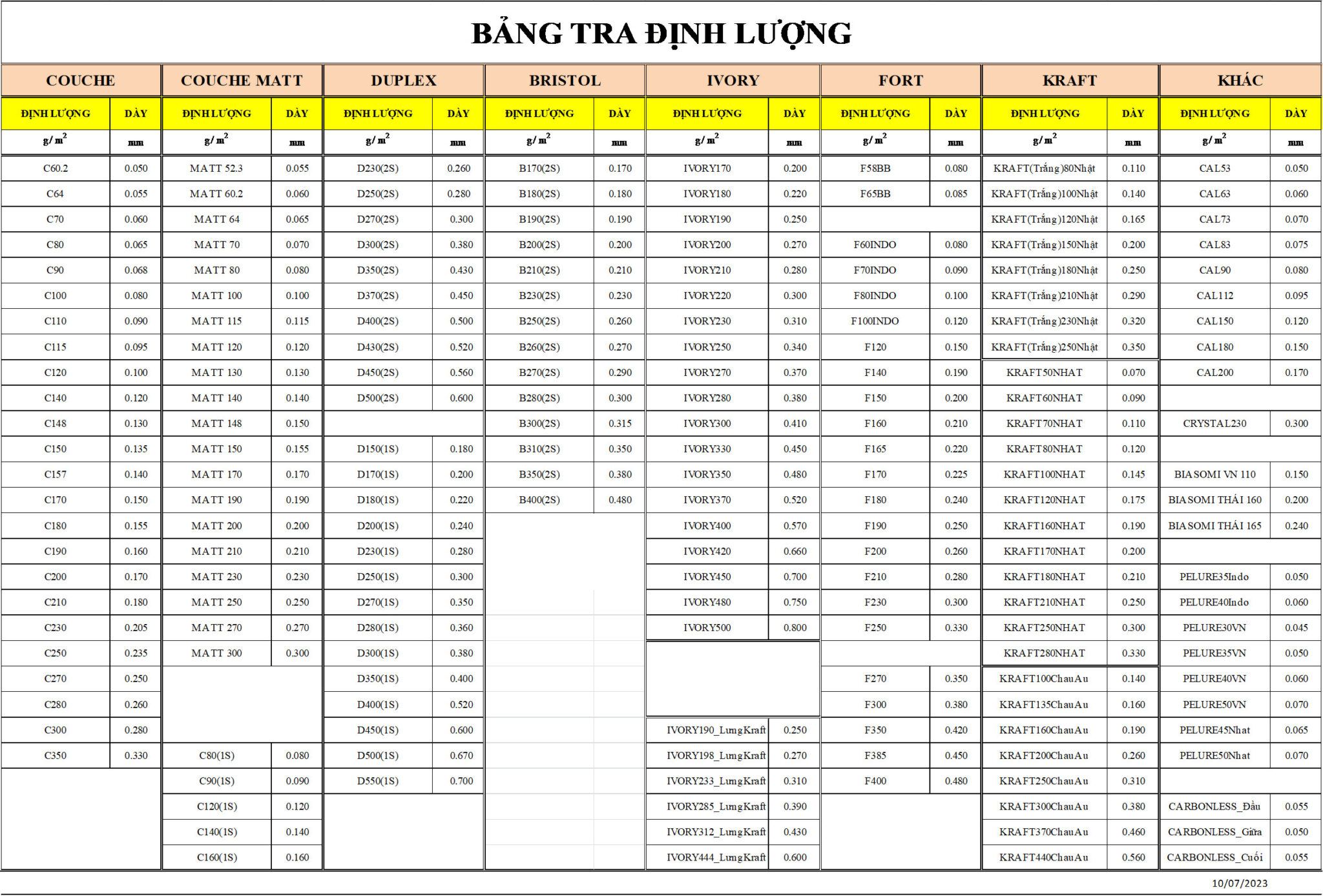 Dùng “Bảng tra định lượng” là phương pháp thực nghiệm, mặc dù có tiện lợi và hữu ích, nhưng phải chấp nhận độ chính xác là tương đối (>=95%); điều kiện là: phân tích đúng loại giấy, sử dụng Panme đúng cách, và kiểm tra độ tin cậy của Bảng tra. Kết quả sẽ kém tin cậy nếu số đo nằm trong khoảng B300-B310, C148-C150, C118-C120, … có thể dùng “cân” theo phương pháp chính thống, và (hoặc) chọn định lượng phù hợp với thị trường, đồng thời ghi rõ định lượng giấy trong Đơn hàng