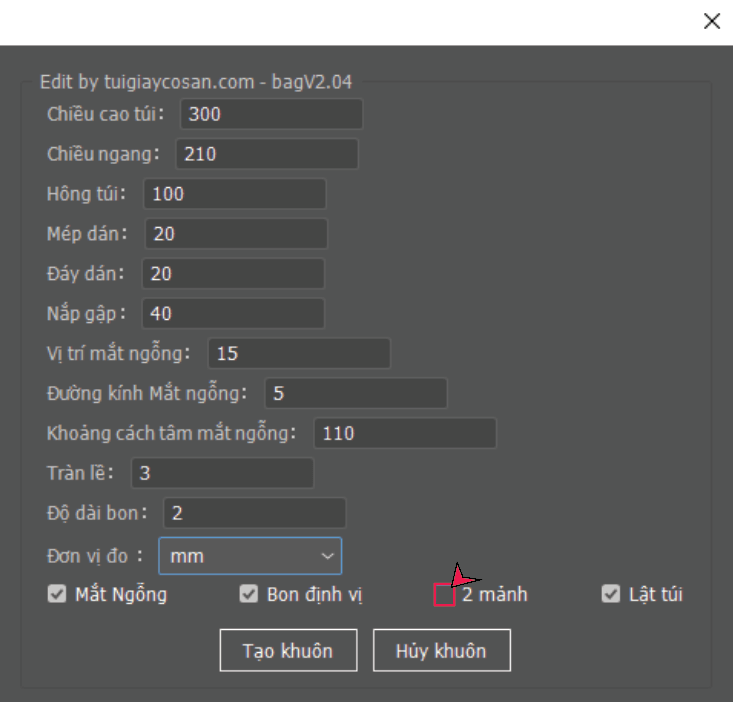 - Lưu ý: Ở đây chúng ta làm túi nguyên nên tắt 2 mảnh đi