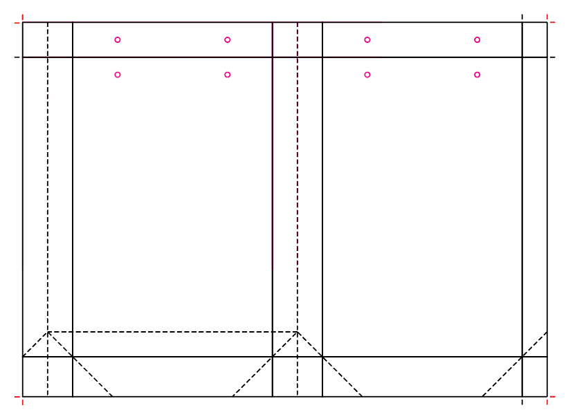 - Sau khi dàn file xong, phải có tối thiểu 4 bon cắt túi (Như hình dưới) – Bon đỏ – nằm ở layze in . Và 4 đường cấn (như hình dưới) – Bon màu đen – nằm ở layze in .